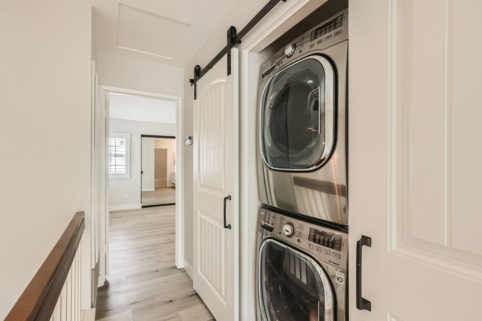 Upstairs, both primary suites are generously sized and situated across the hall from each other, each featuring vaulted ceilings, abundant natural light, and updated en-suite bathrooms. The laundry area is conveniently located upstairs near the bedrooms.
