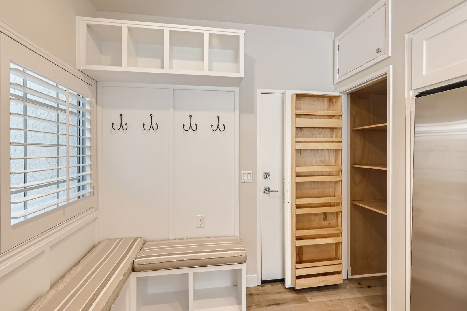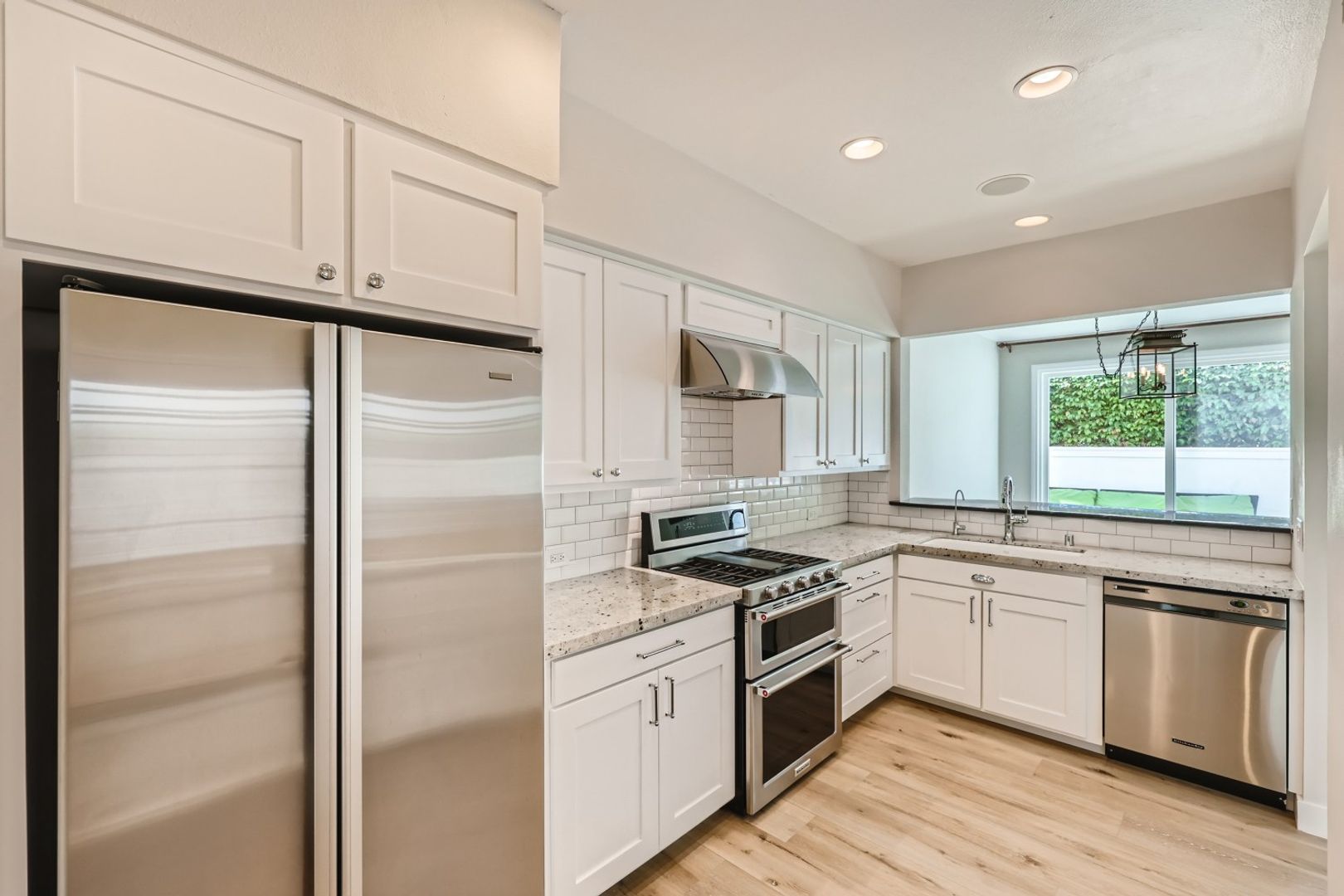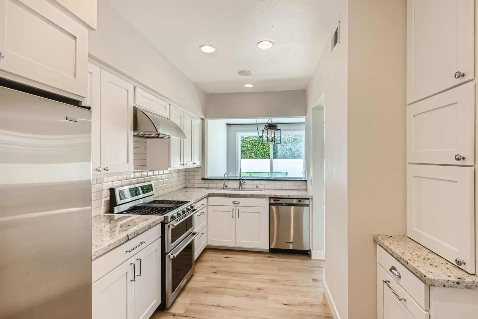 The remodeled kitchen showcases white shaker cabinetry, quartz countertops, stainless steel appliances (refrigerator, stove, double oven, dishwasher, microwave), gas cooking, a spacious pantry, and a charming built-in banquette with hidden storage, creating a functional and inviting dining space.